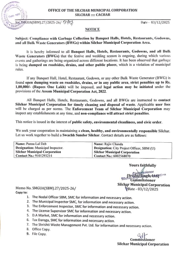 7 03/12/2025 Compliance with Garbage Collection by Banquet Halls, Hotels, Restaurants, Godowns, and all Bulk Waste Generators (B WGs) within Silchar Municipal Corporation Area. Waste Management